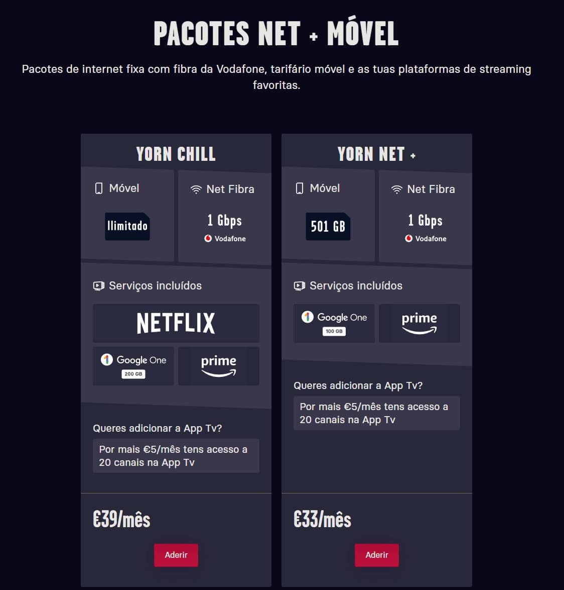 Por lo tanto, el «nuevo» Yorn Chill trae una red móvil ilimitada, Vodafone Fiber a 1 Gbps y Netflix, Google One (200 GB) y Amazon Prime por 39 €/mes. Yorn Net+ desciende a 501 GB de datos móviles y menos adicionales, permaneciendo a € 33/mes. Ambos aún pueden tener 20 canales de TV para otros 5 €.