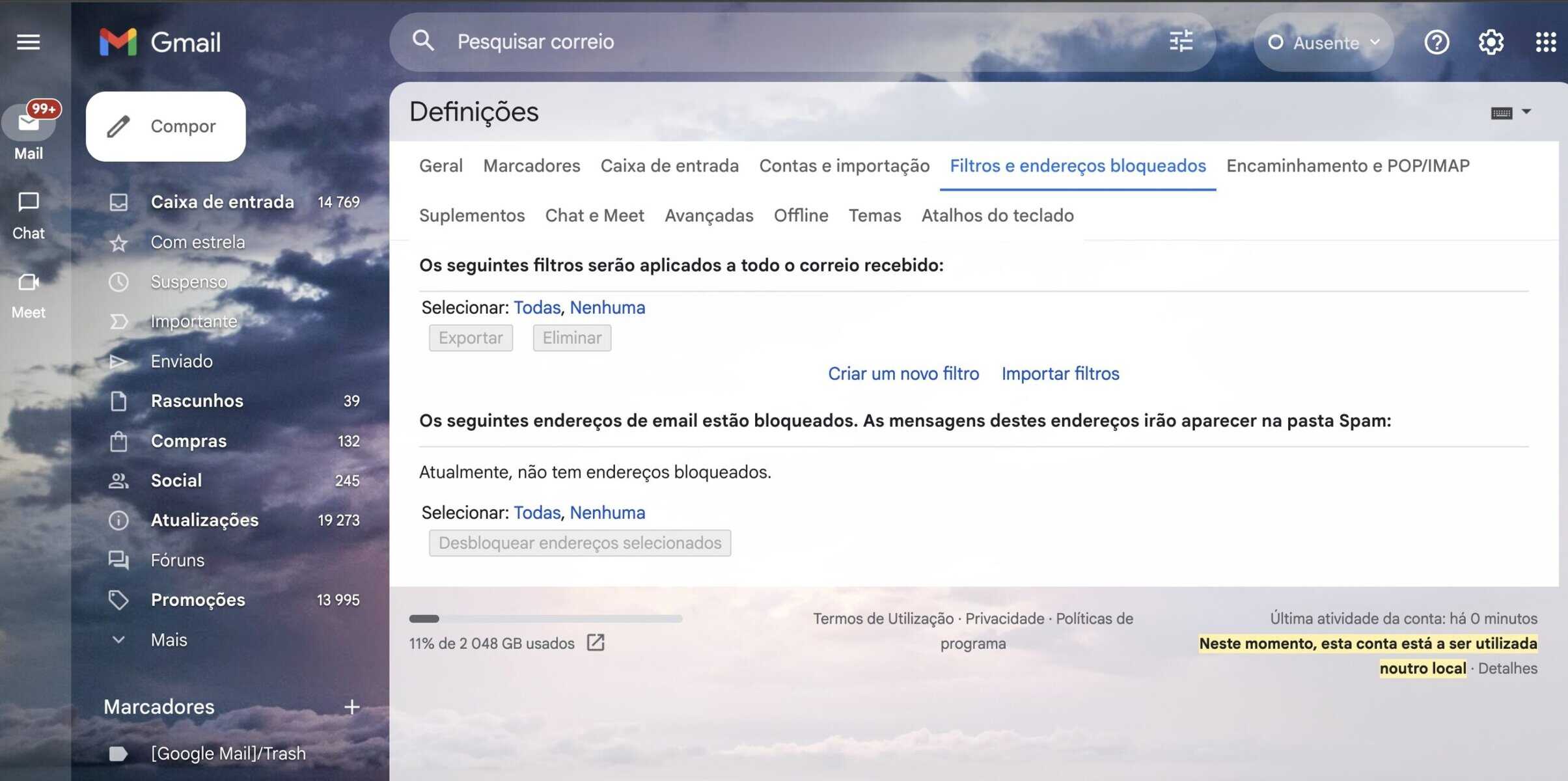 Abra Gmail en su computadora, haga clic en la rueda ⚙️ → Ver todas las configuraciones → Filtros y direcciones bloqueadas → Crear un nuevo filtro.